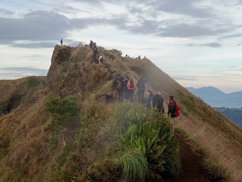 From the summit of Mount Batur, you can watch the sun rise slowly behind Mount Abang and Lake Batur. On a clear, fog-free day, this moment truly takes your breath away—the first rays of light slowly emerge from the eastern horizon, transforming the atmosphere from darkness to light.